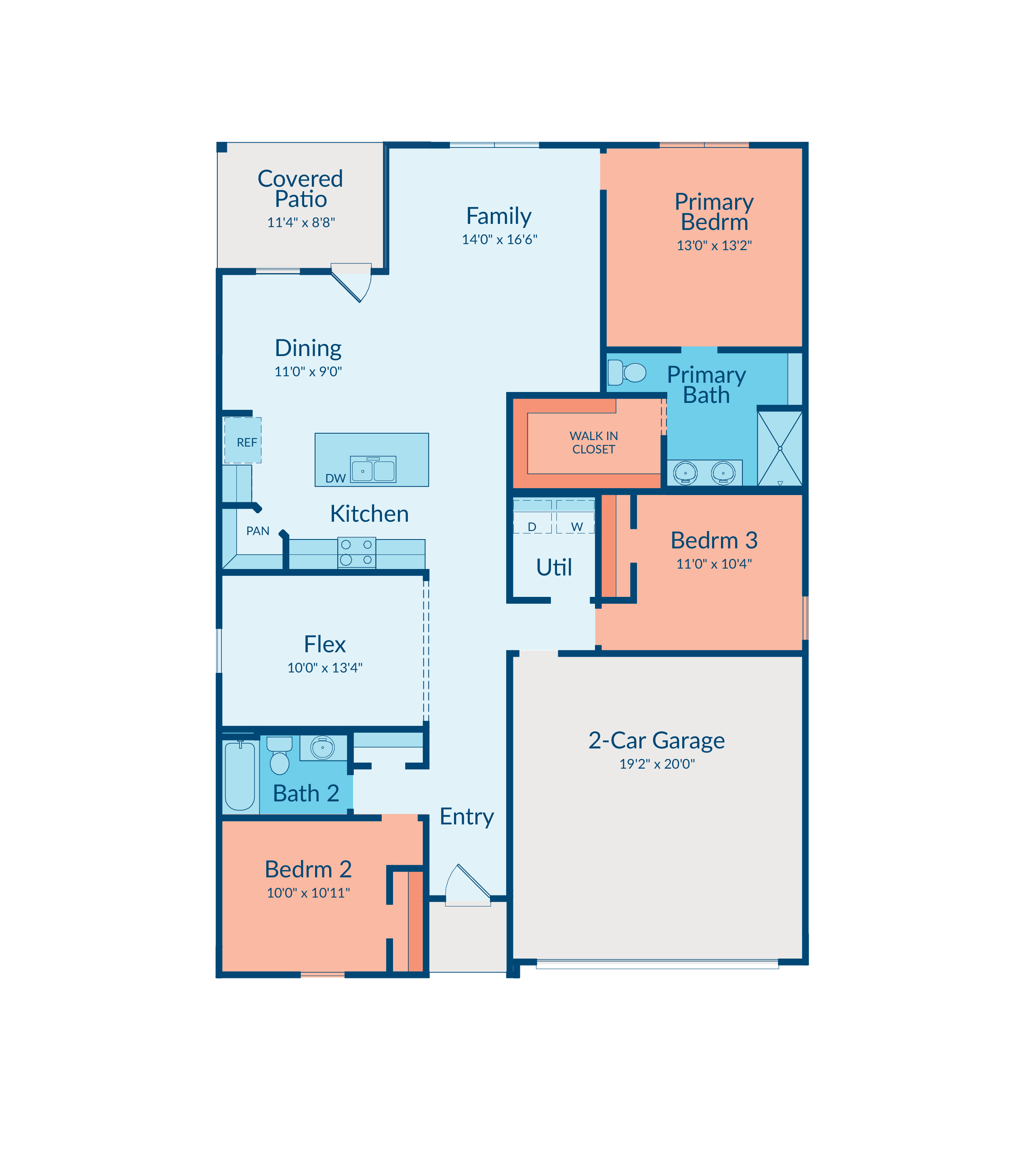 Sight lines extend from the front door to the back windows, creating an open, connected feel. The kitchen includes an island and corner pantry, while the primary bedroom offers an en suite bath and walk-in closet. Two guest rooms with no shared walls, a flex room and a covered patio complete the plan.