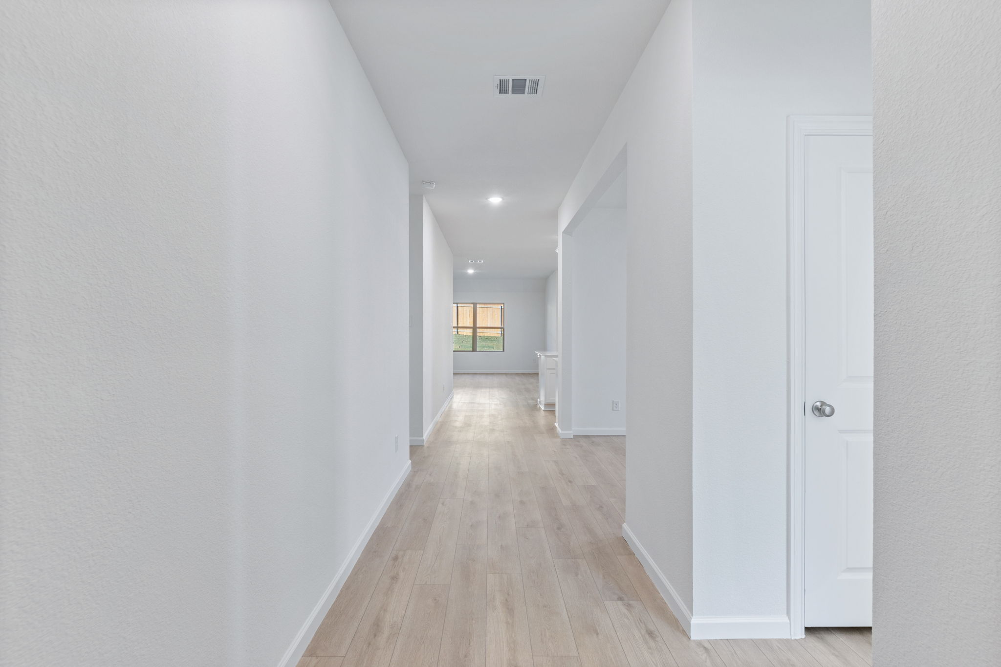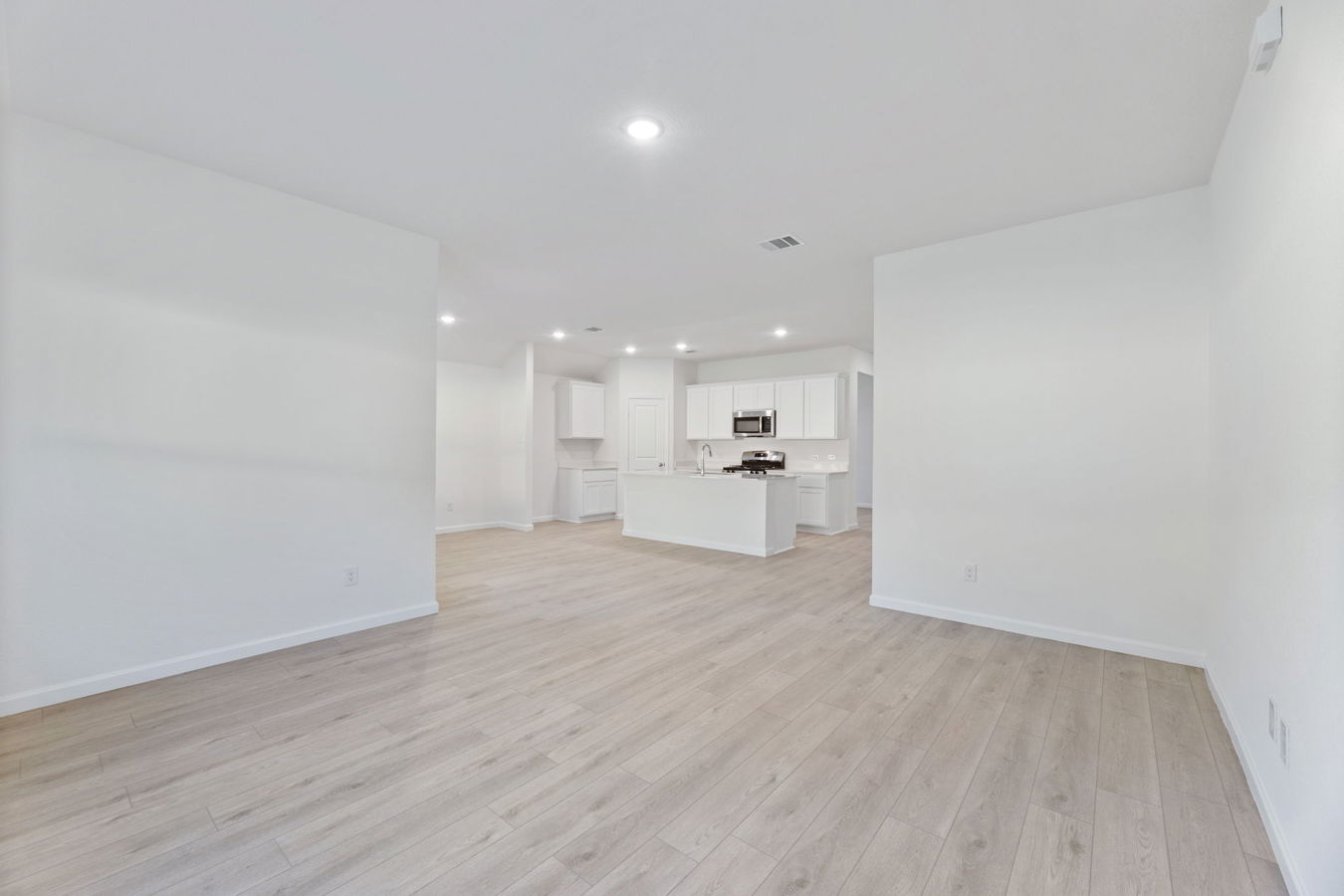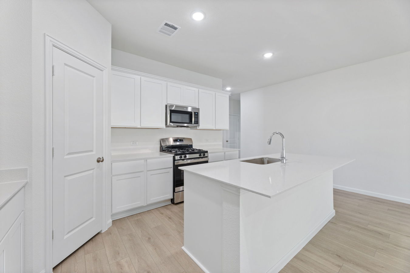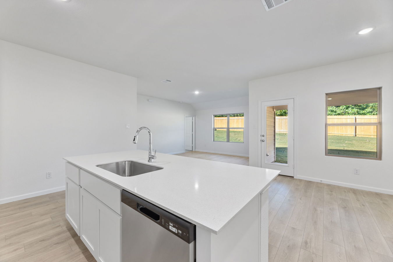 Sight lines extend from the front door to the back windows. The open kitchen includes an island, corner pantry, white Shaker-style cabinets, and Blanco Bordo quartz countertops.