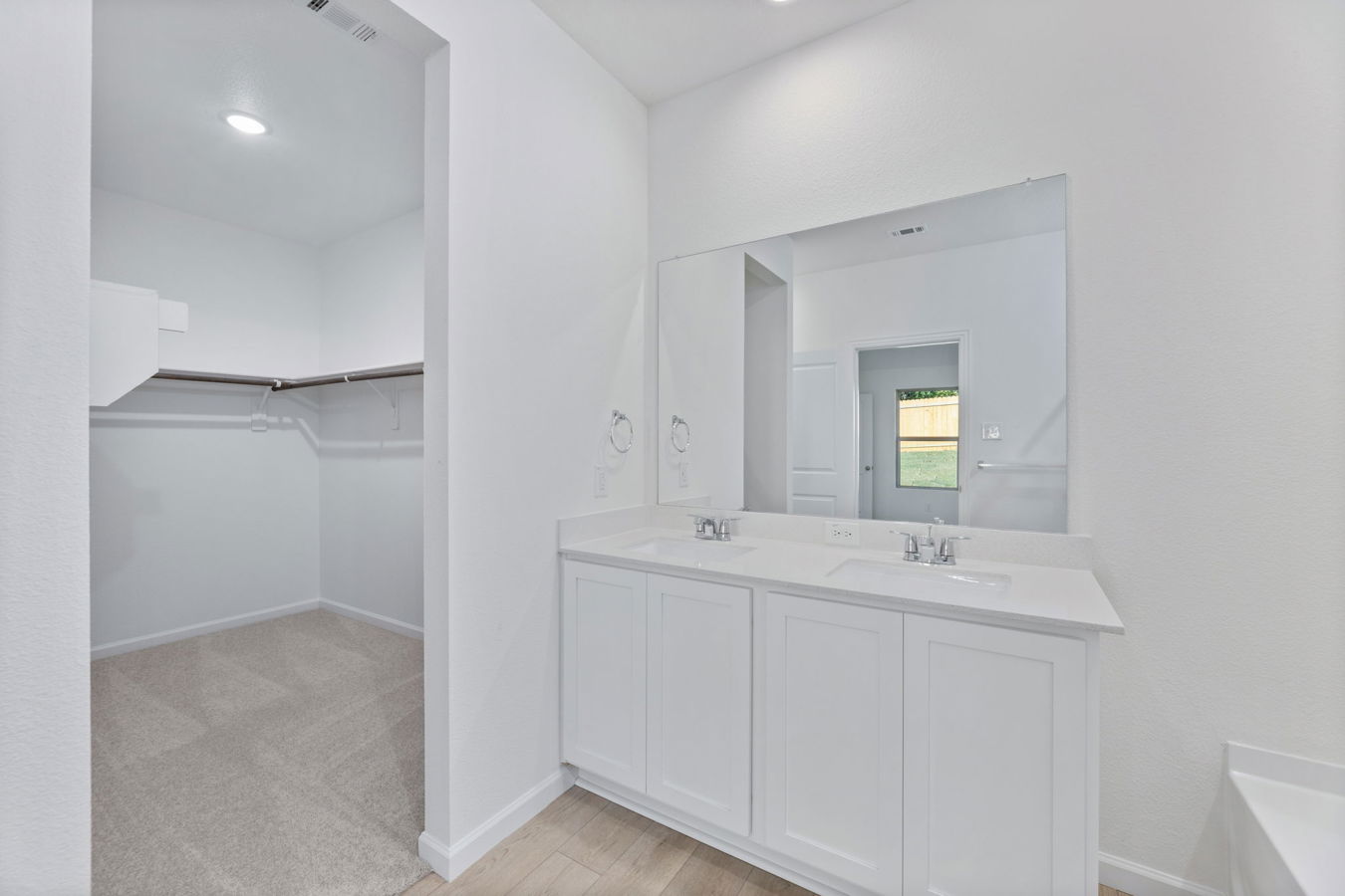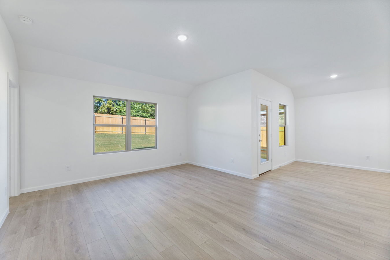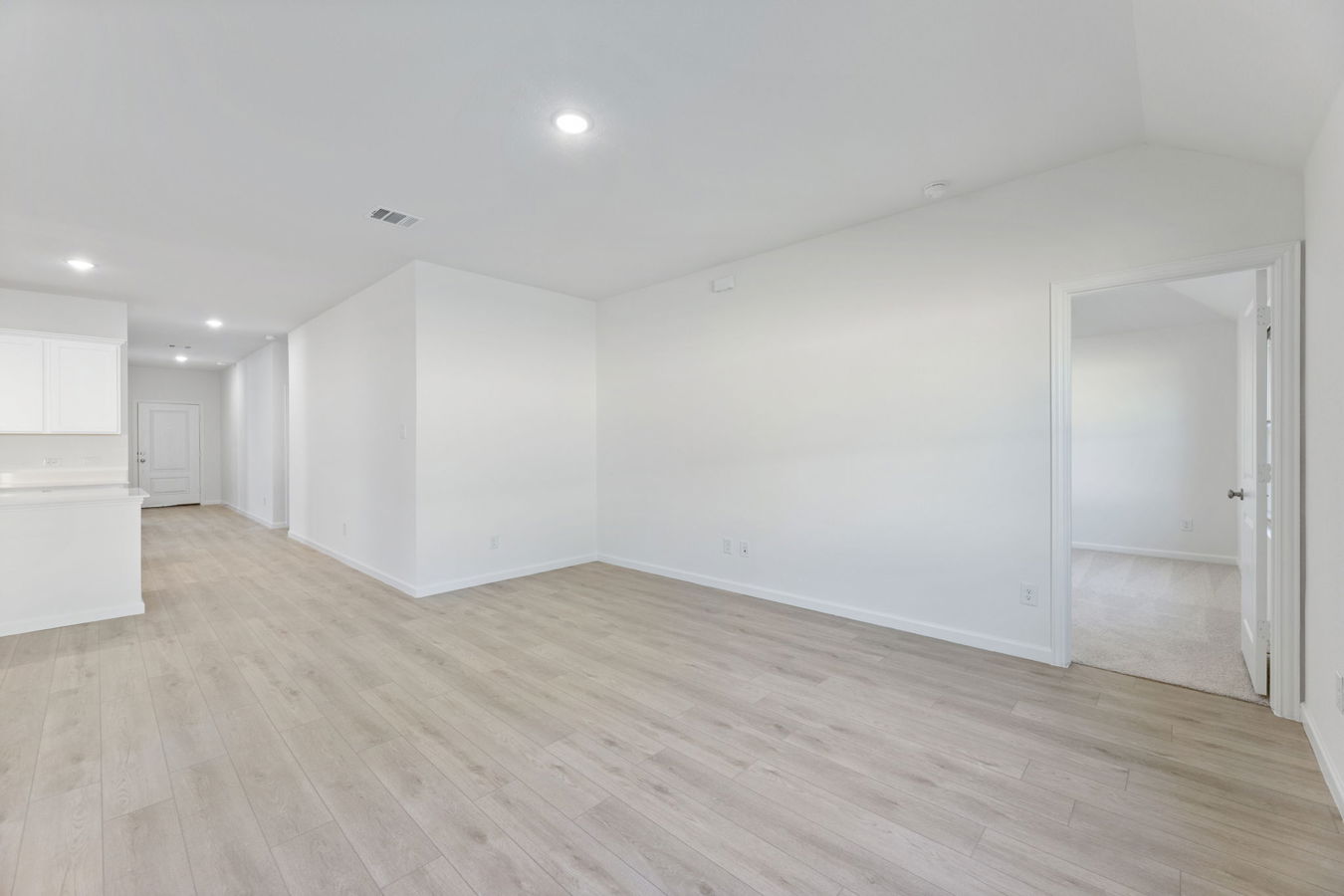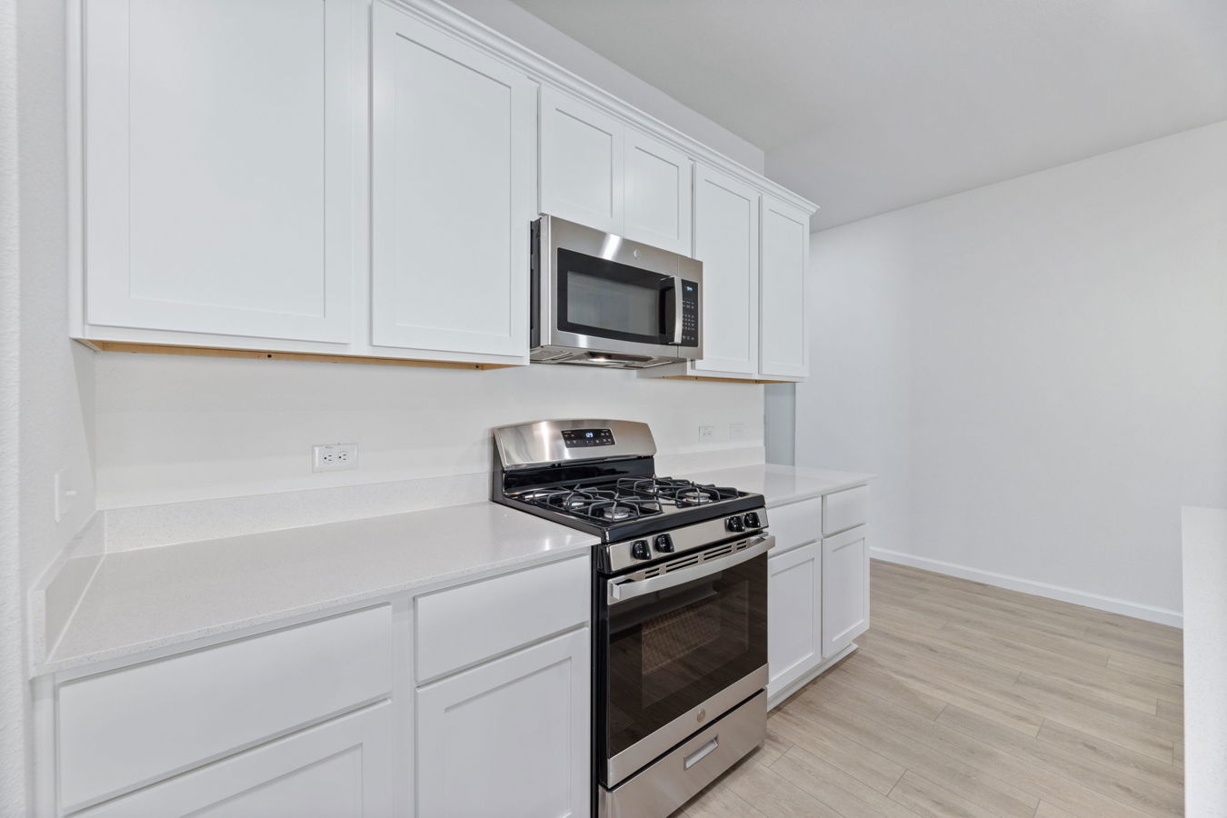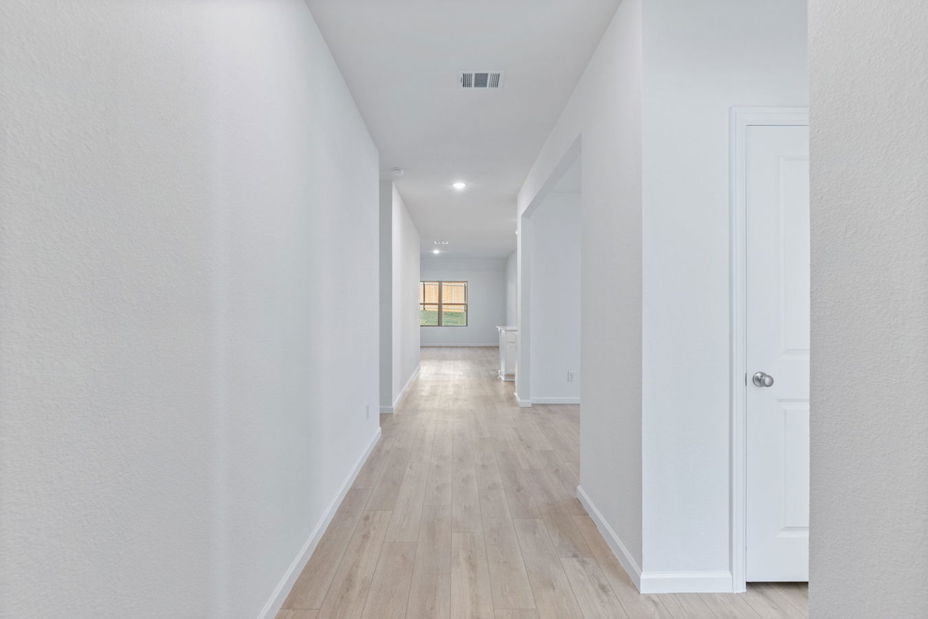 Sight lines extend from the front door to the back windows. The open kitchen includes an island, corner pantry, white Shaker-style cabinets, and Blanco Bordo quartz countertops.