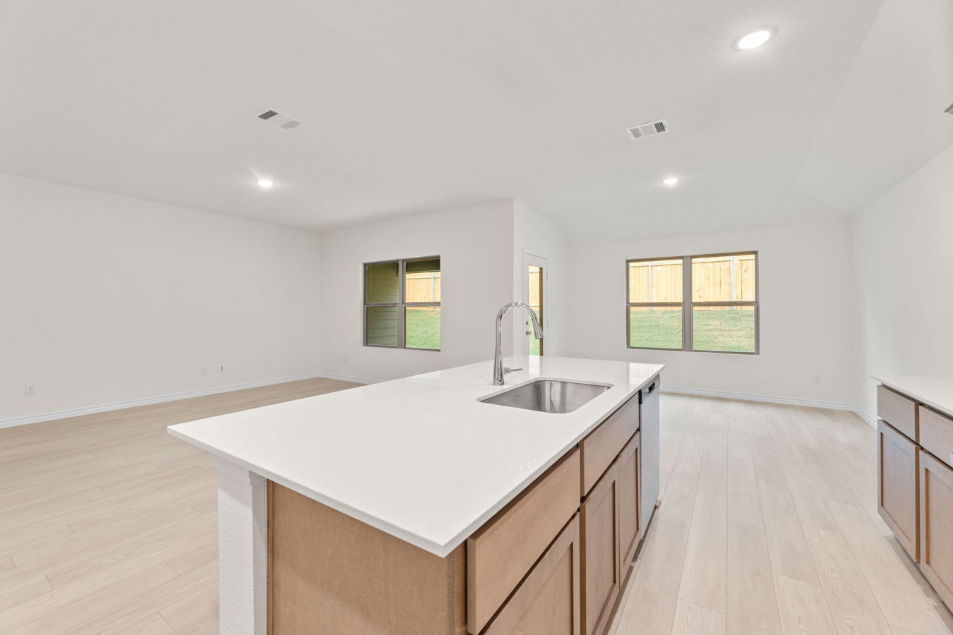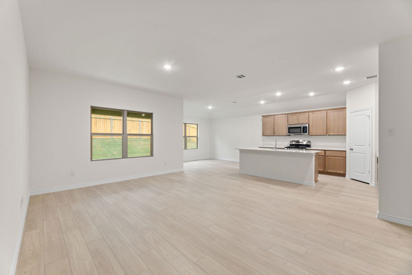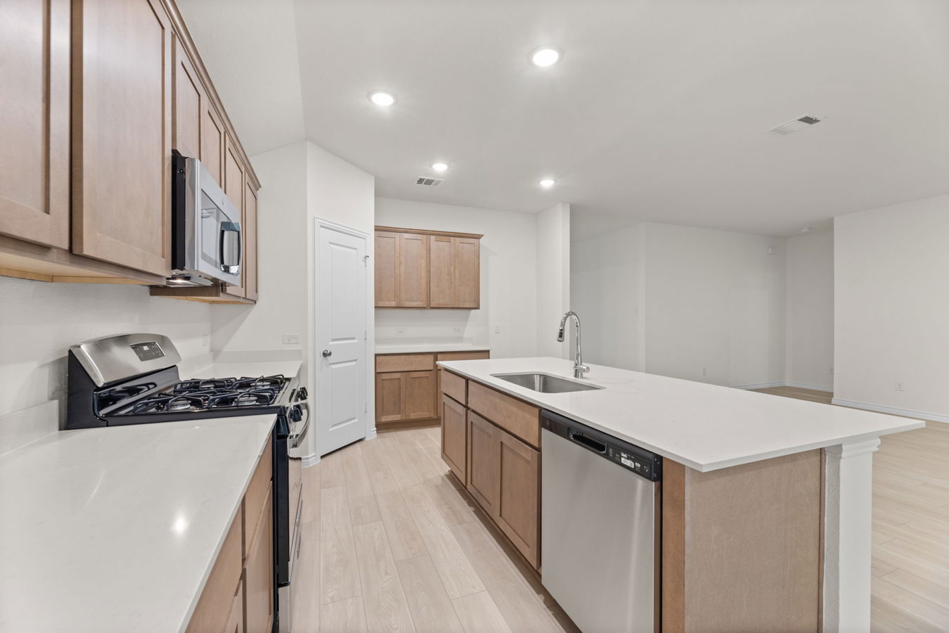 Sight lines extend from the front door to the back windows. The open kitchen offers an island, corner pantry, Dune-stained Shaker-style cabinets, and South Beach quartz countertops.