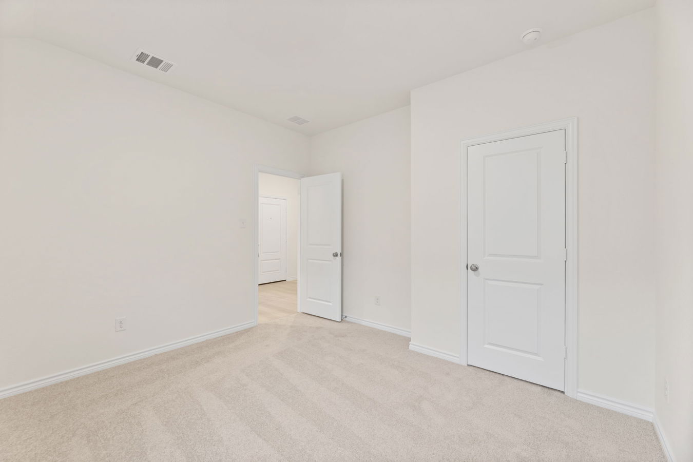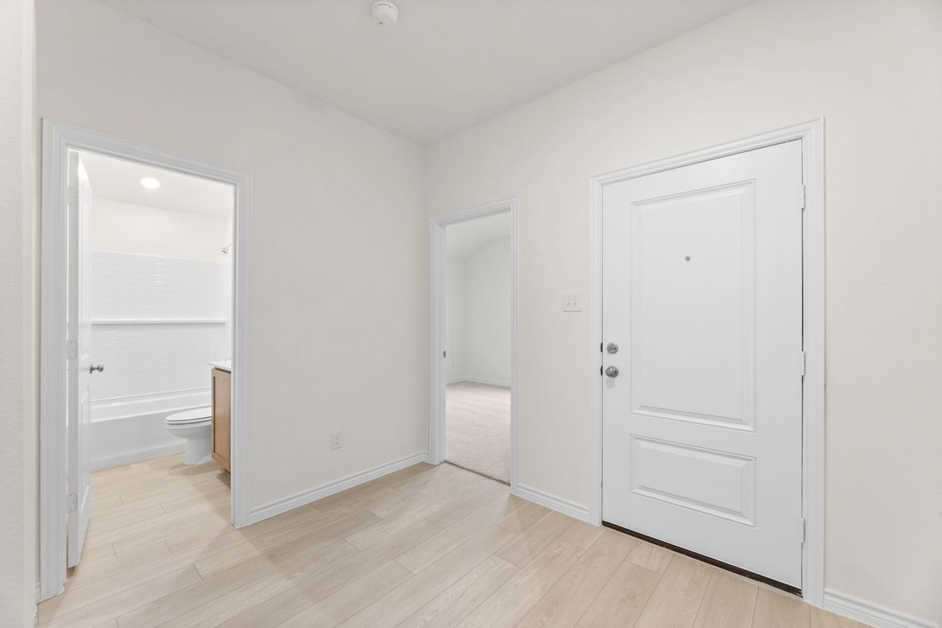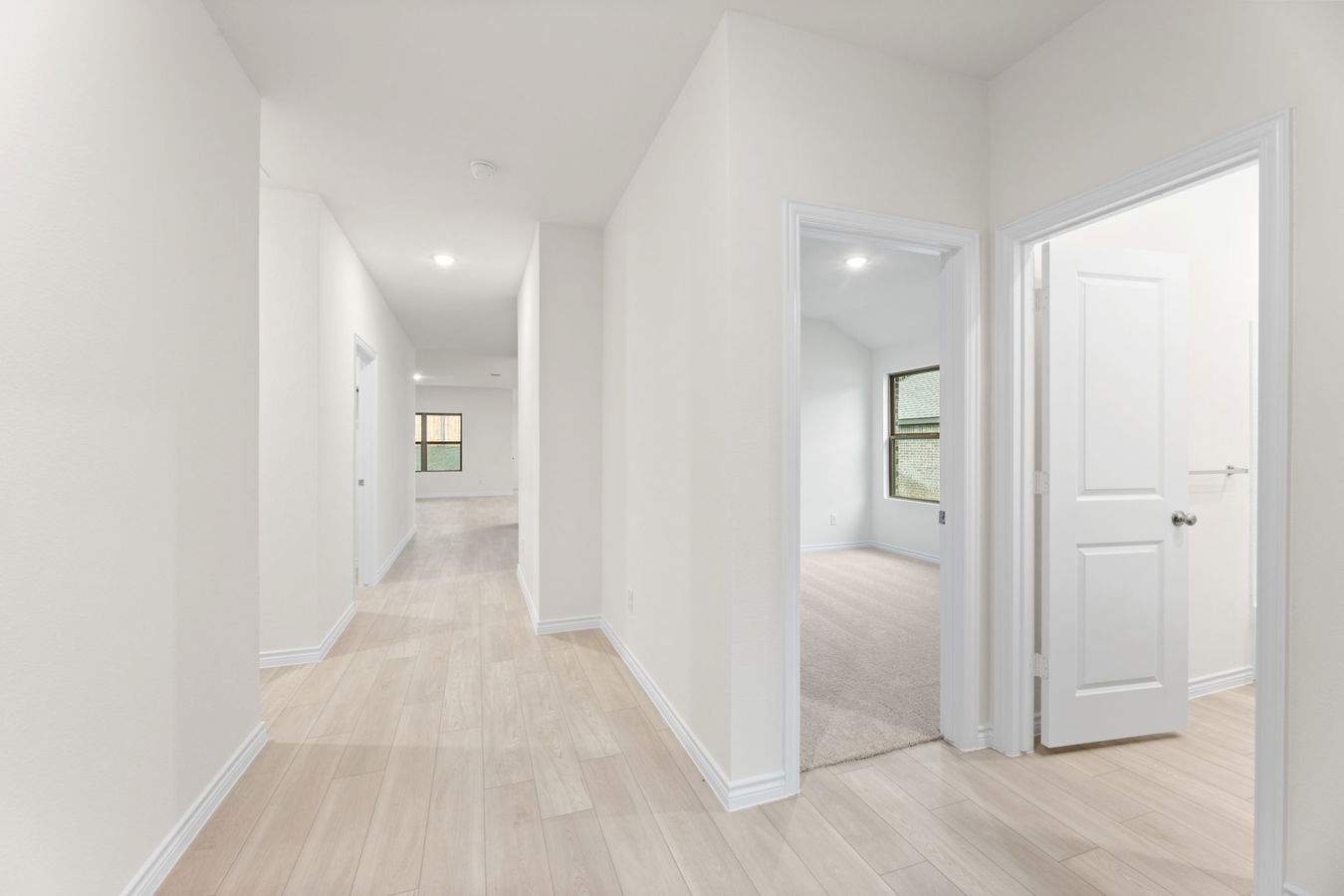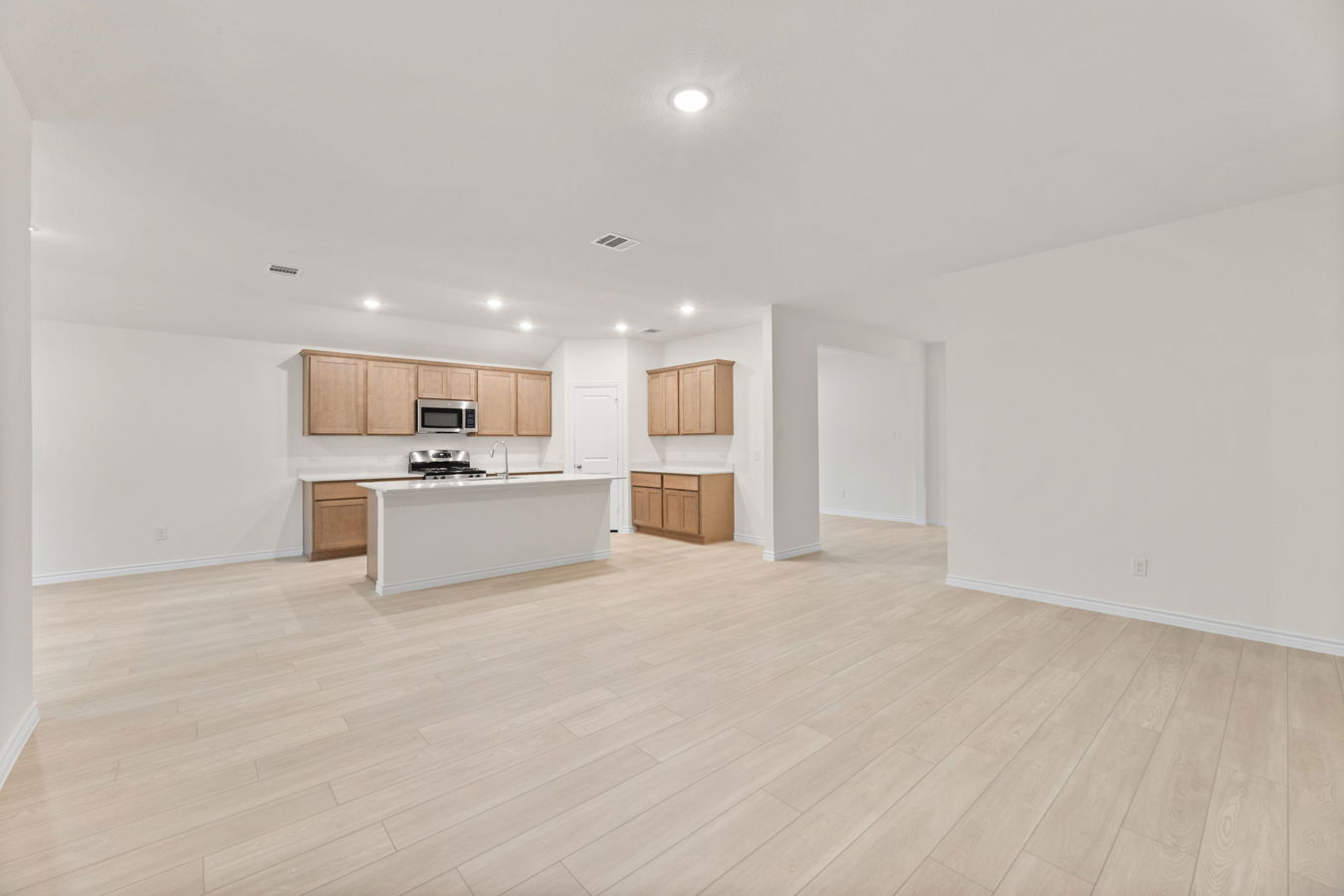 Sight lines extend from the front door to the back windows. The open kitchen offers an island, corner pantry, Dune-stained Shaker-style cabinets, and South Beach quartz countertops.
