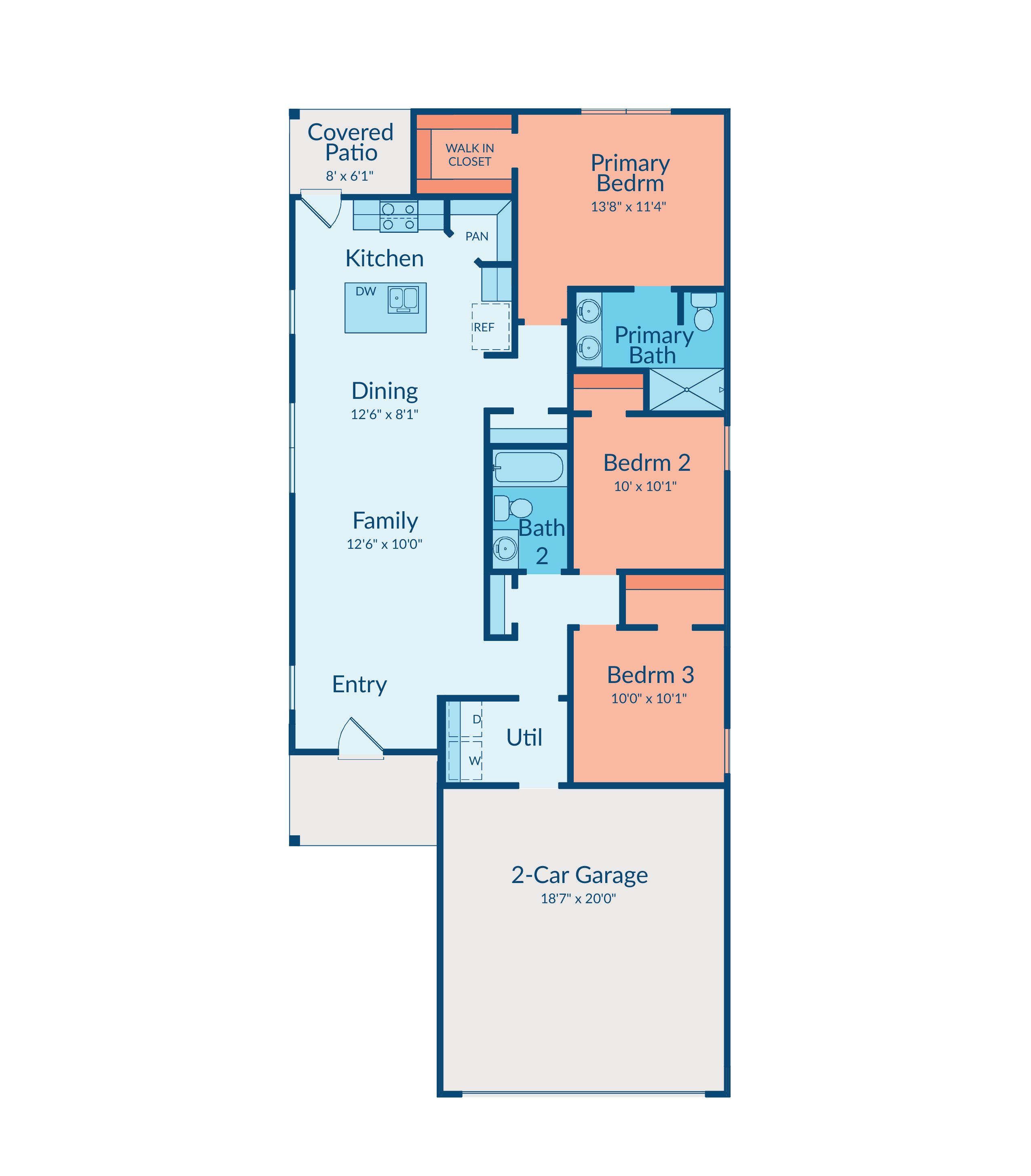 Sight lines extend from the front door to the back windows, creating an open and welcoming feel. The streamlined kitchen features a corner pantry and island designed for everyday convenience.