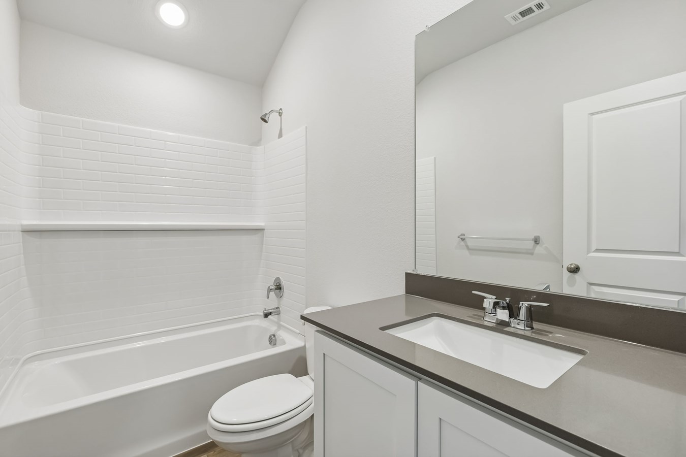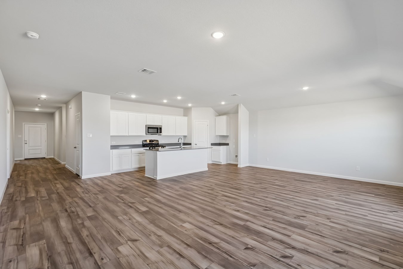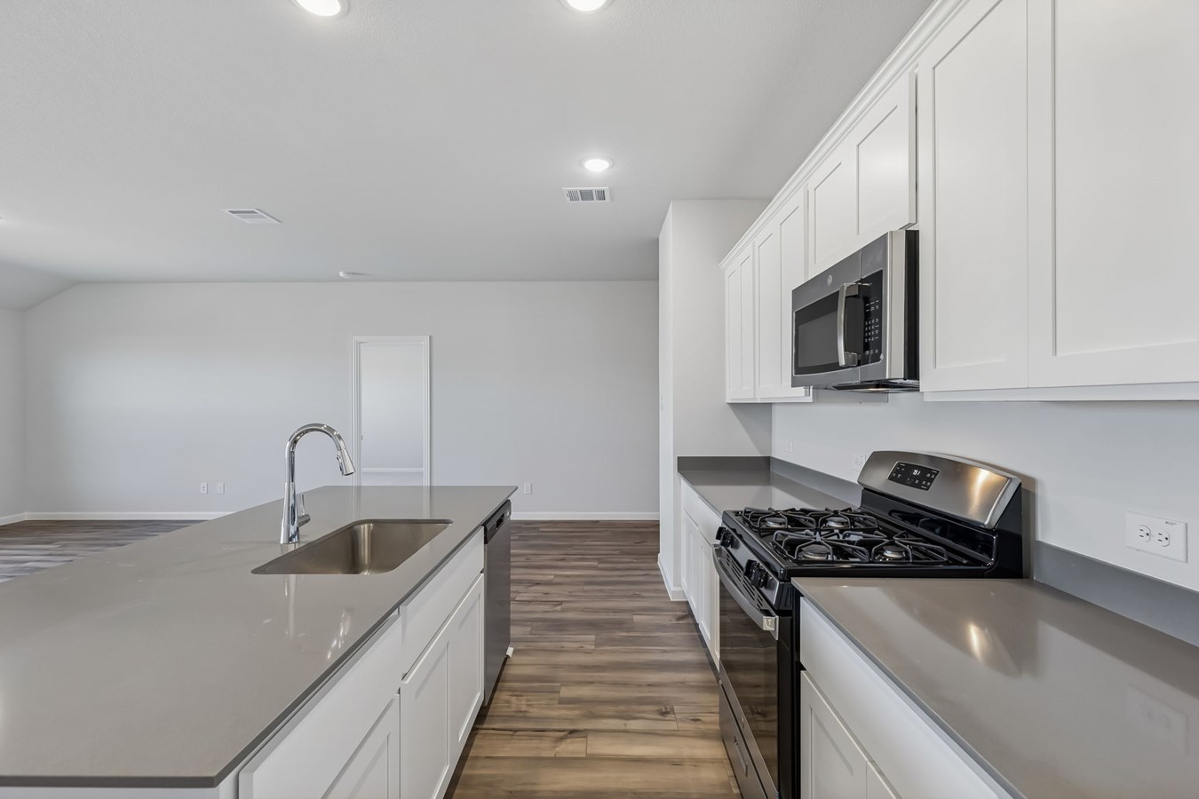 Sea Glass luxury vinyl plank flooring enhances the living spaces and bathrooms, while Shaker-style kitchen cabinets painted Snow and Grigio quartz countertops complete the stylish design.