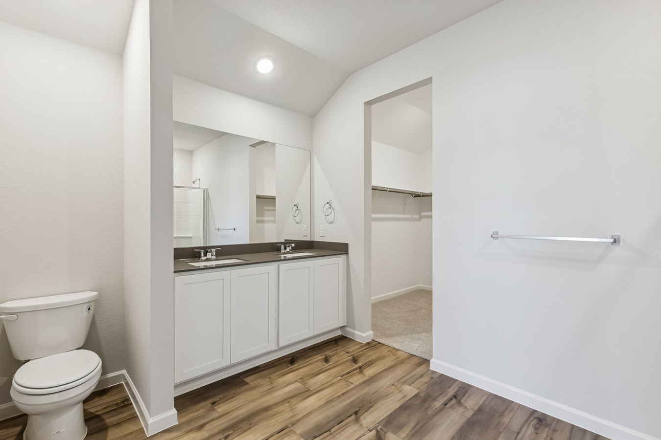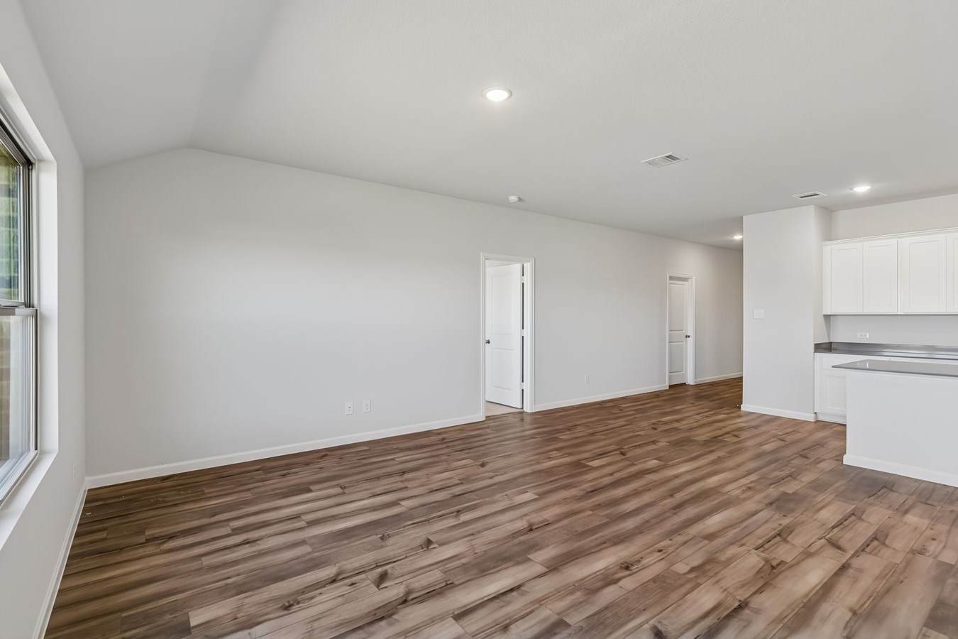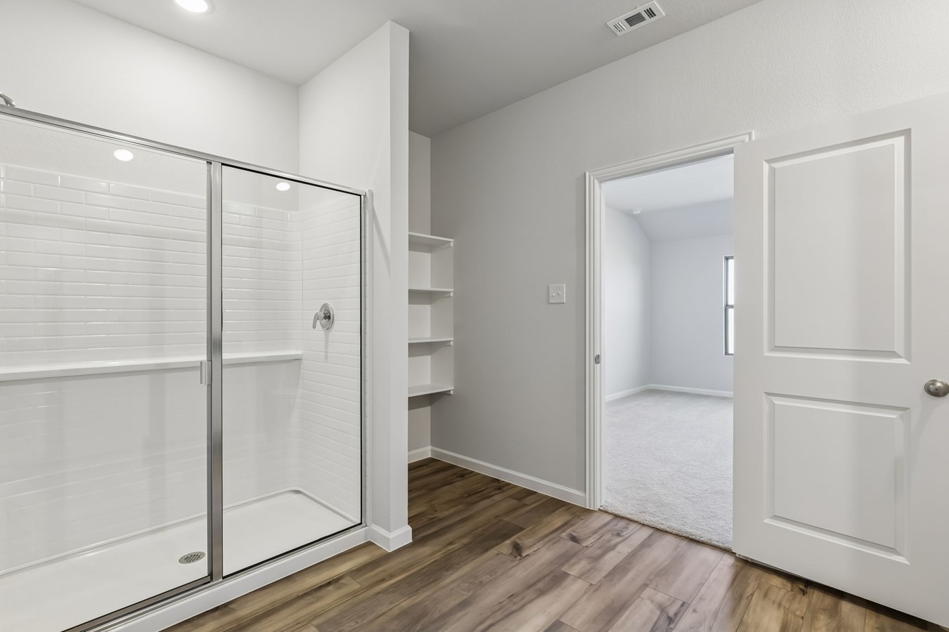 Sea Glass luxury vinyl plank flooring enhances the living spaces and bathrooms, while Shaker-style kitchen cabinets painted Snow and Grigio quartz countertops complete the stylish design.