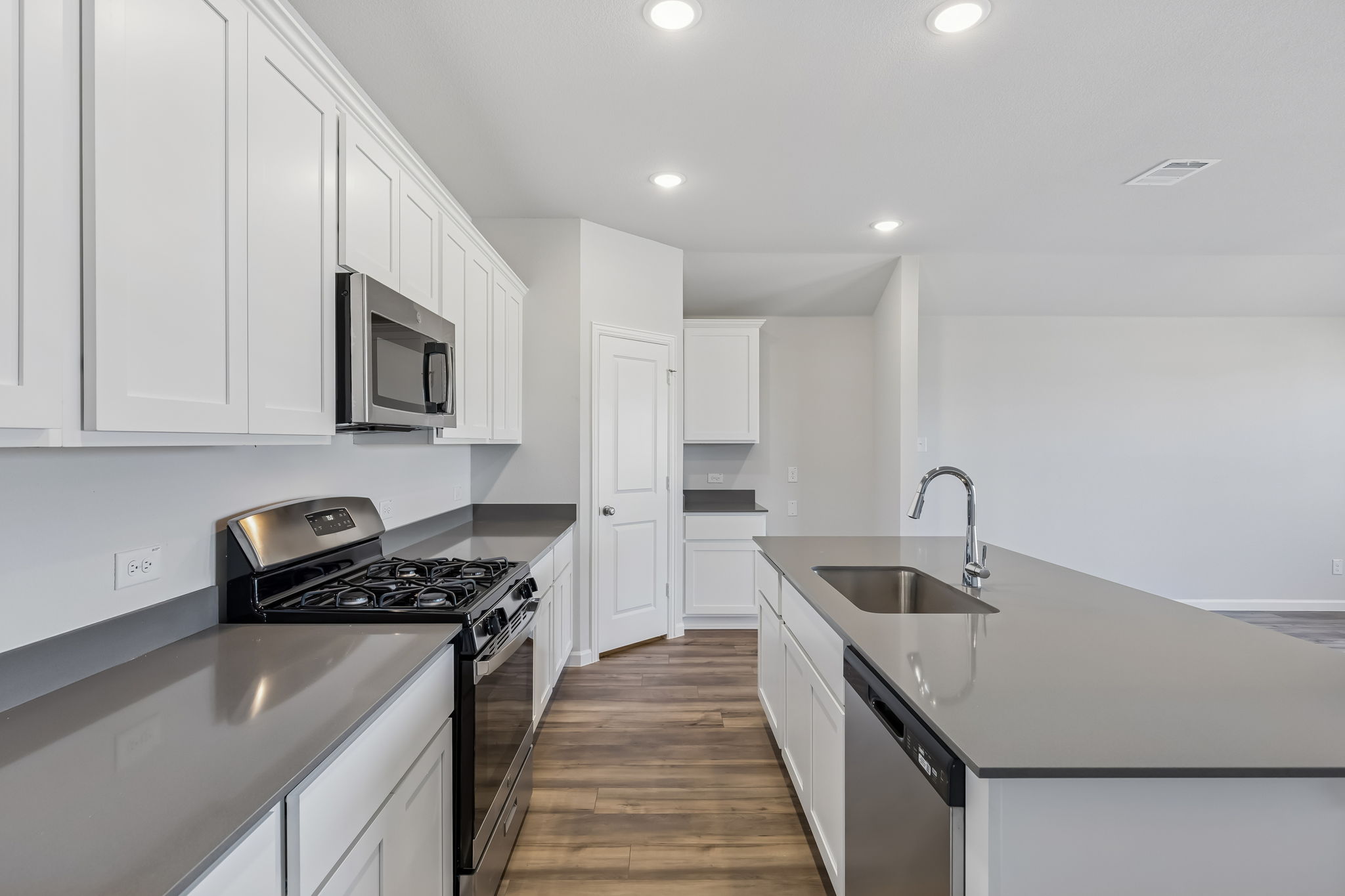 The open kitchen includes an island and corner pantry designed for everyday function and entertaining. The primary bedroom features an en suite bath and walk-in closet for added comfort.