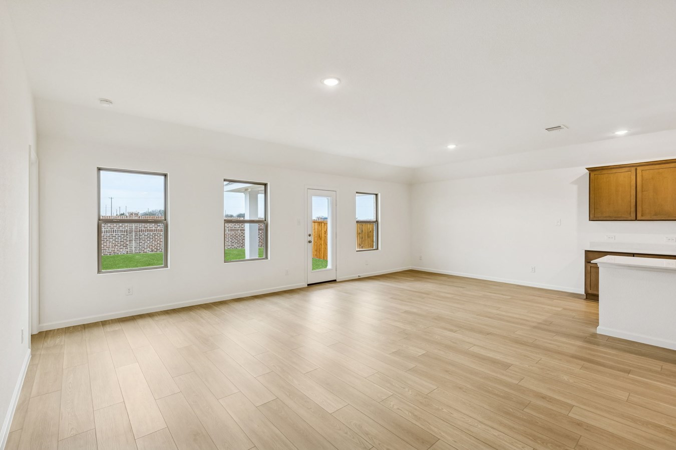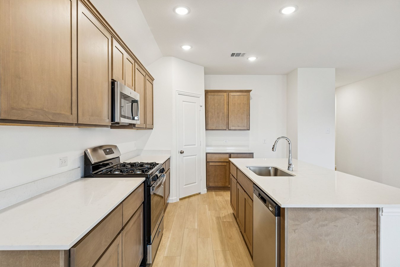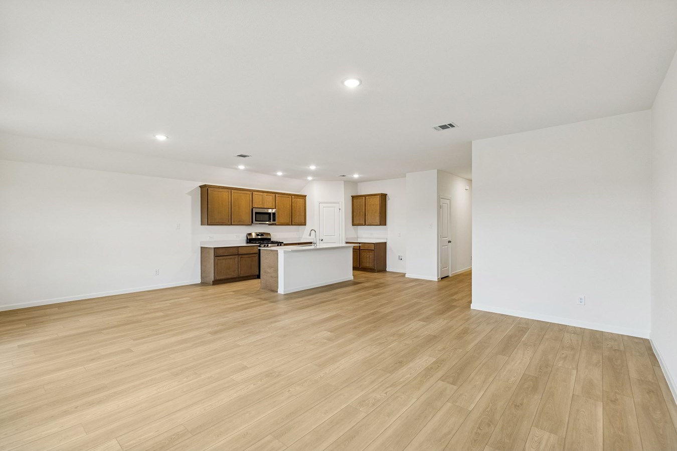Sight lines extend from the front door to the back windows, giving the home an airy and connected feel. The open kitchen includes an island and corner pantry, designed to make meal preparation simple and social.