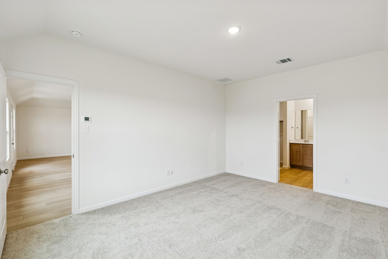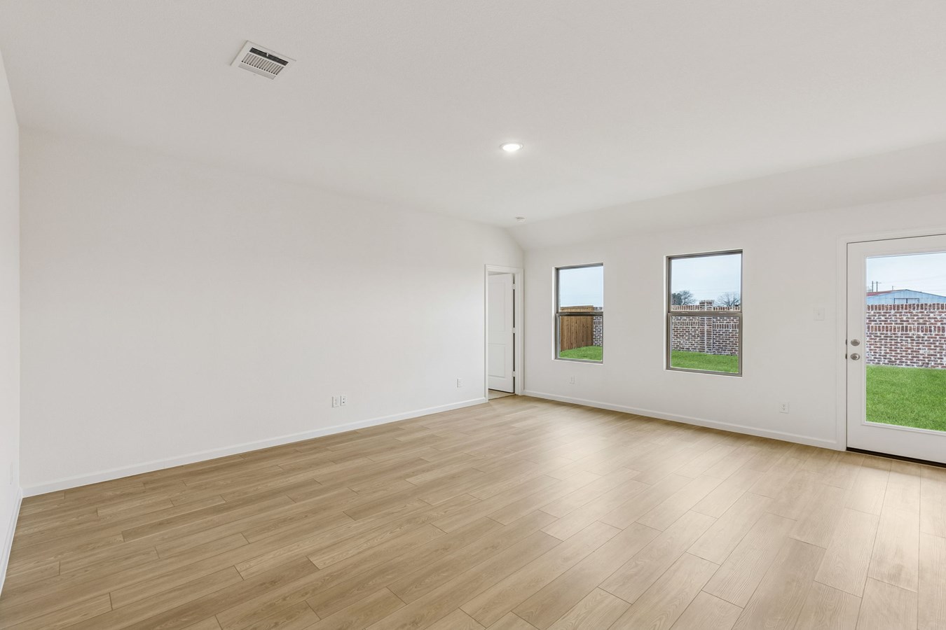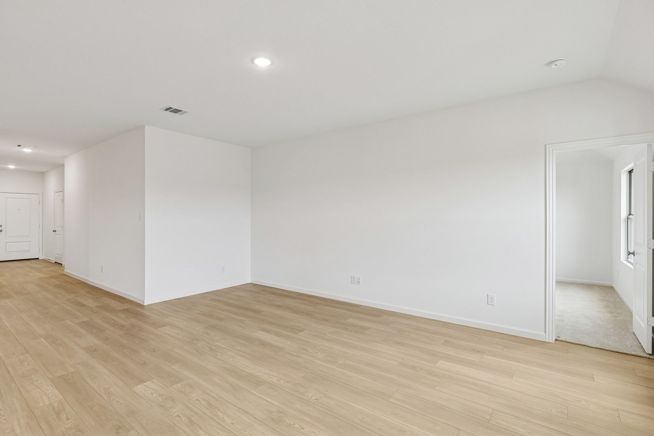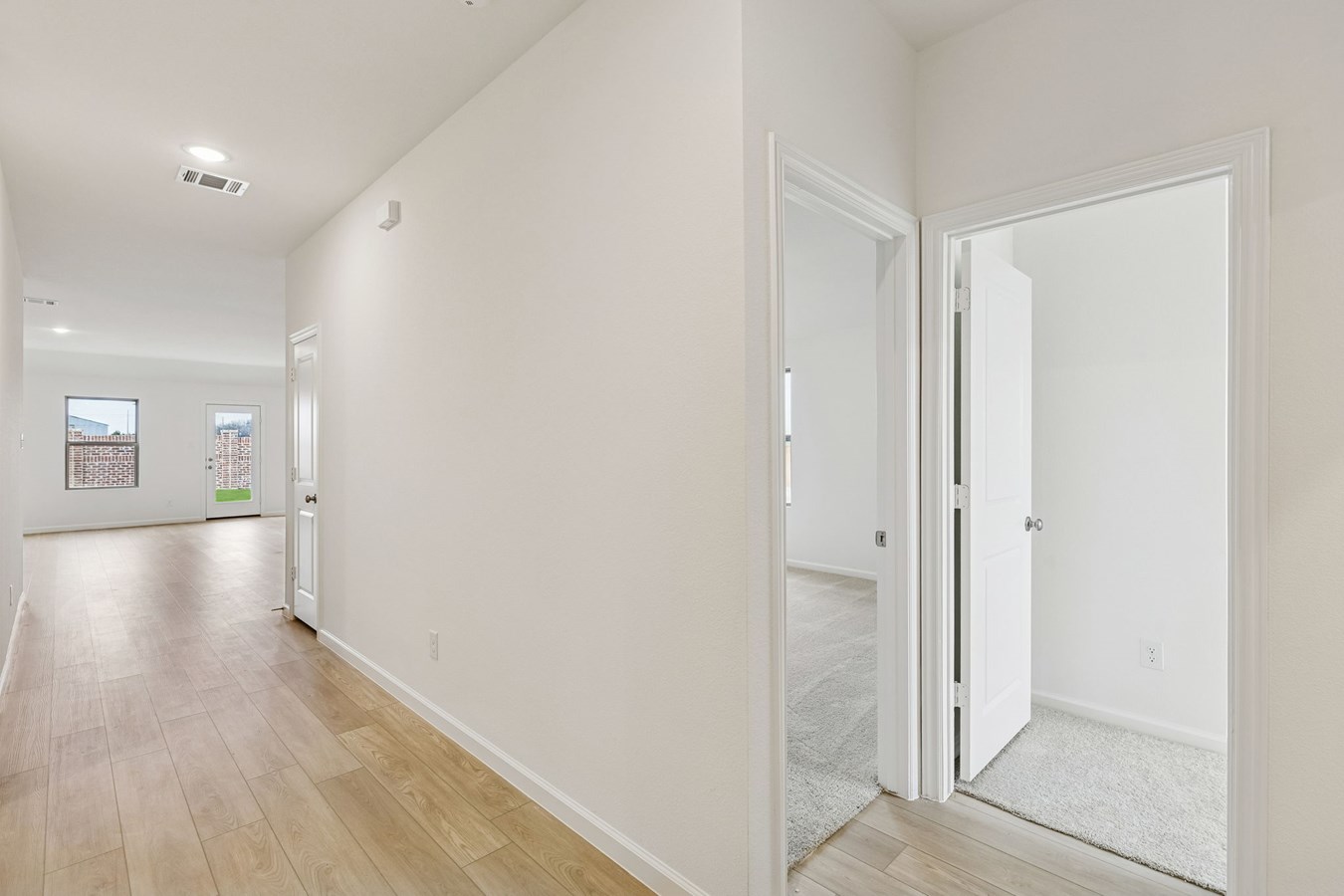 Sight lines extend from the front door to the back windows, giving the home an airy and connected feel. The open kitchen includes an island and corner pantry, designed to make meal preparation simple and social.