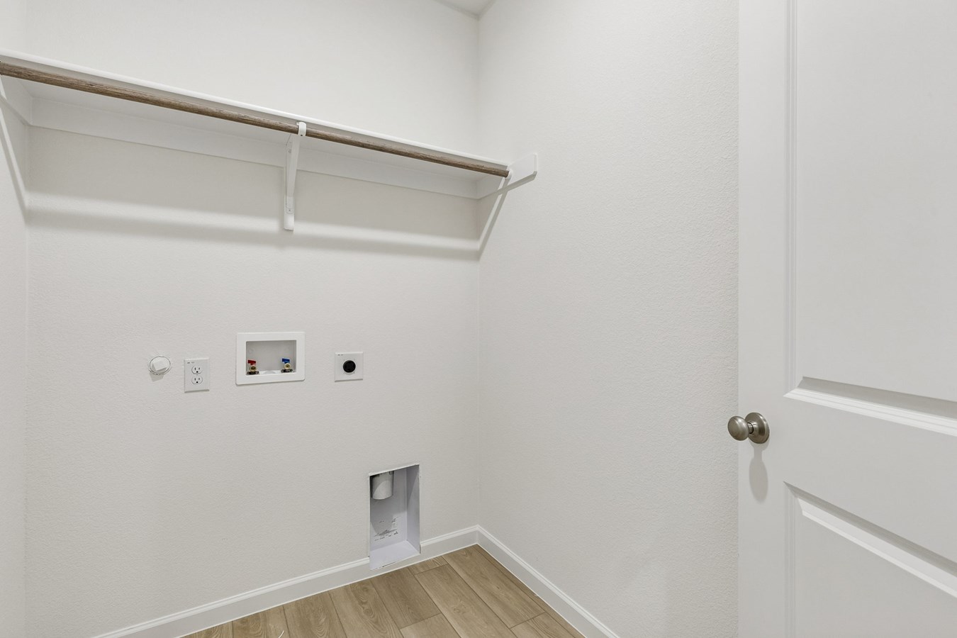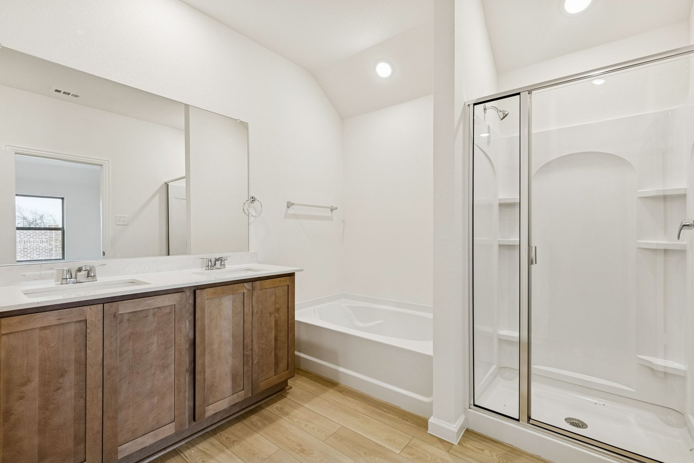 Silver Dollar luxury vinyl plank flooring enhances the living areas and bathrooms, complemented by Shaker-style kitchen cabinets stained Dune and South Beach quartz countertops.