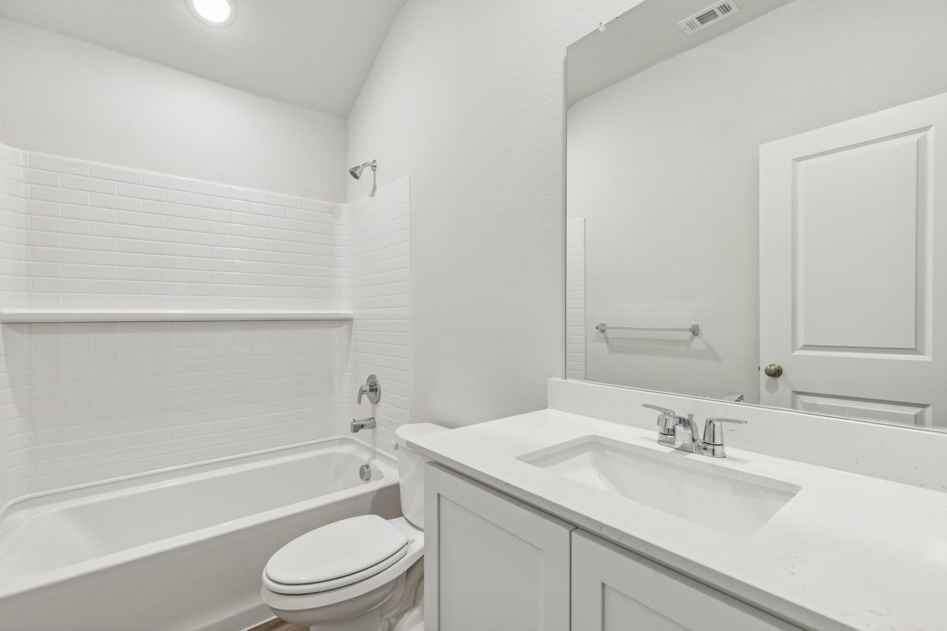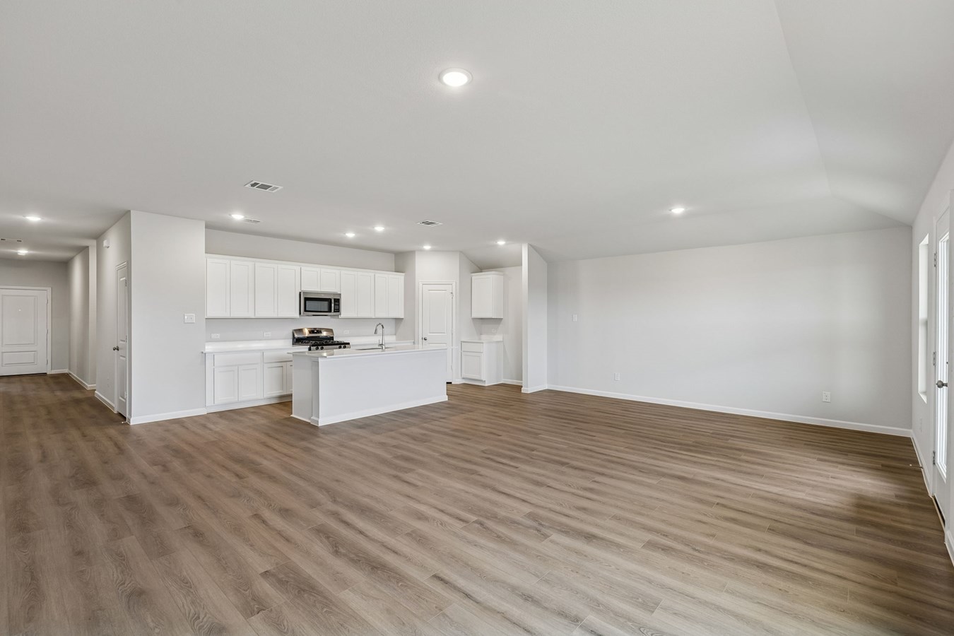 Ashen Brown luxury vinyl plank flooring flows through the living spaces and bathrooms, complemented by Shaker-style kitchen cabinets painted Snow and Carrara Gioia quartz countertops for a timeless look.