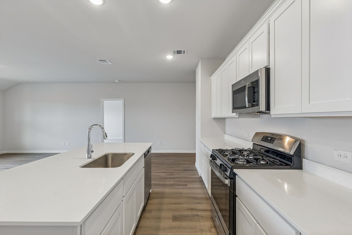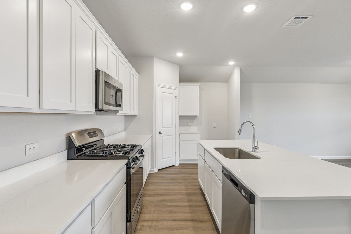 The open kitchen includes an island and corner pantry that make meal preparation and organization a breeze. The primary bedroom features an en suite bath and walk-in closet designed for comfort and convenience.