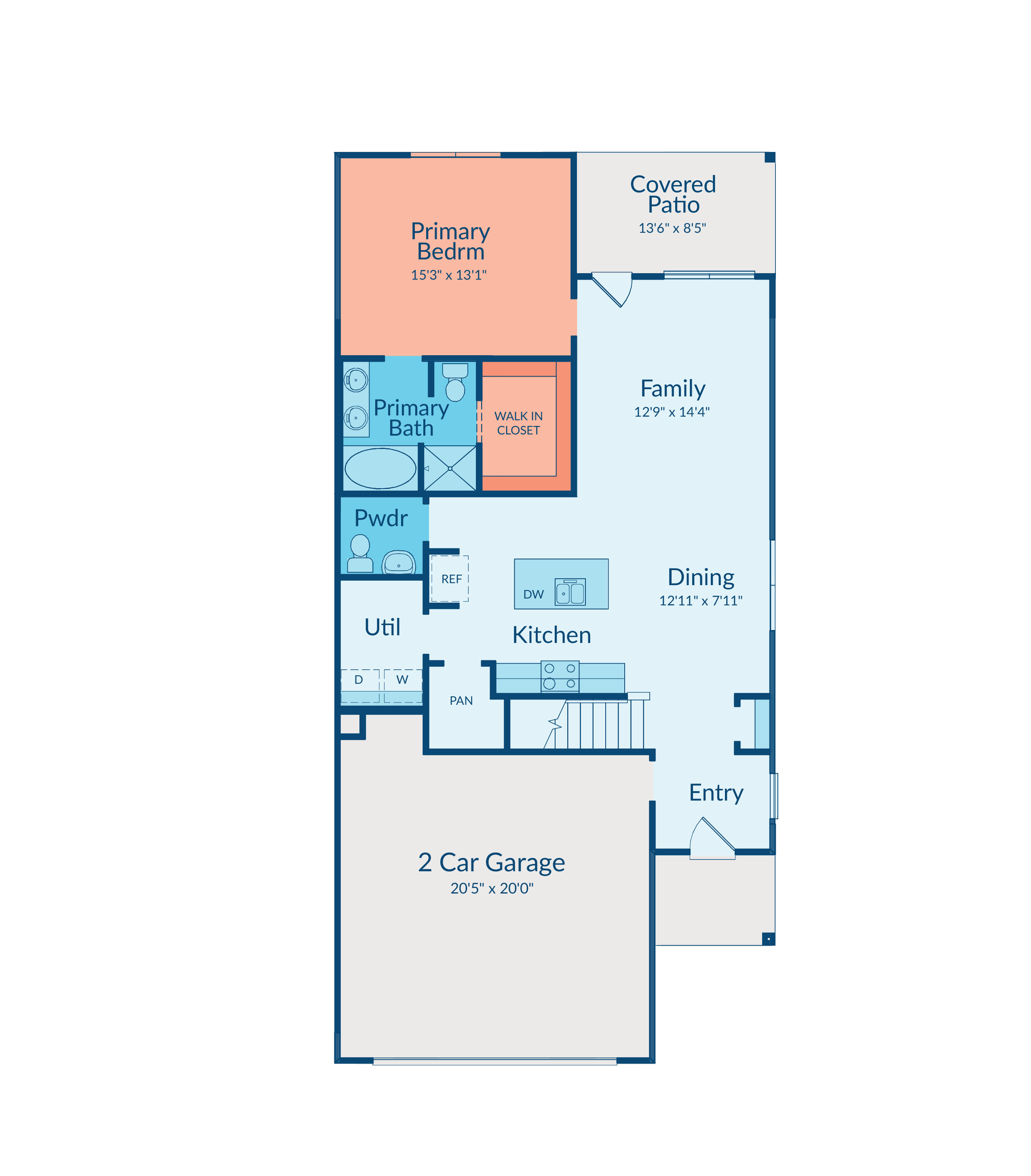 This two-story home includes first-floor living spaces designed for connection. The private primary bedroom on the main level features a walk-in closet and en suite bath.