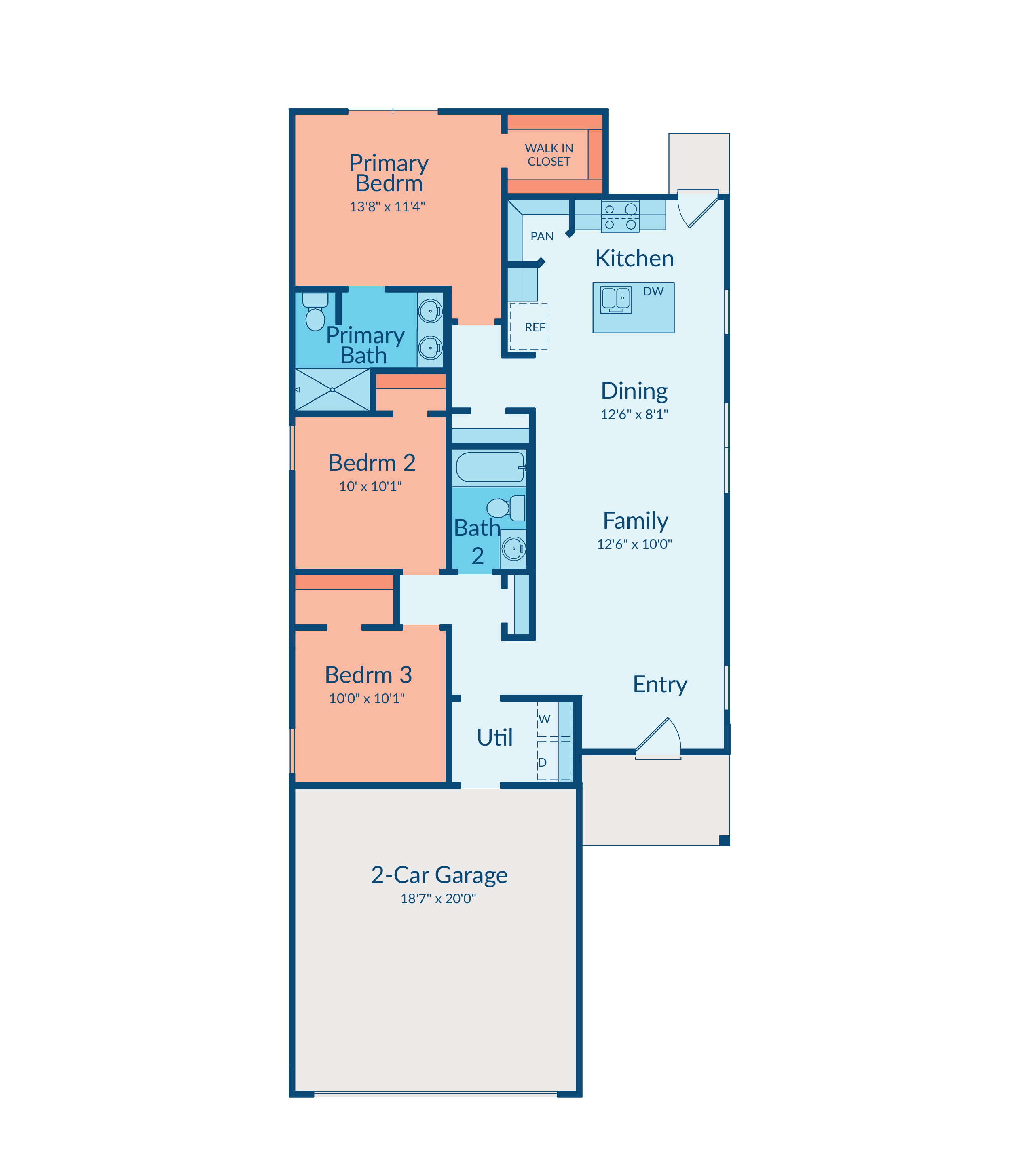 Sight lines extend from the front door to the back windows, creating a bright and connected layout. The streamlined kitchen includes a corner pantry and island for everyday convenience.