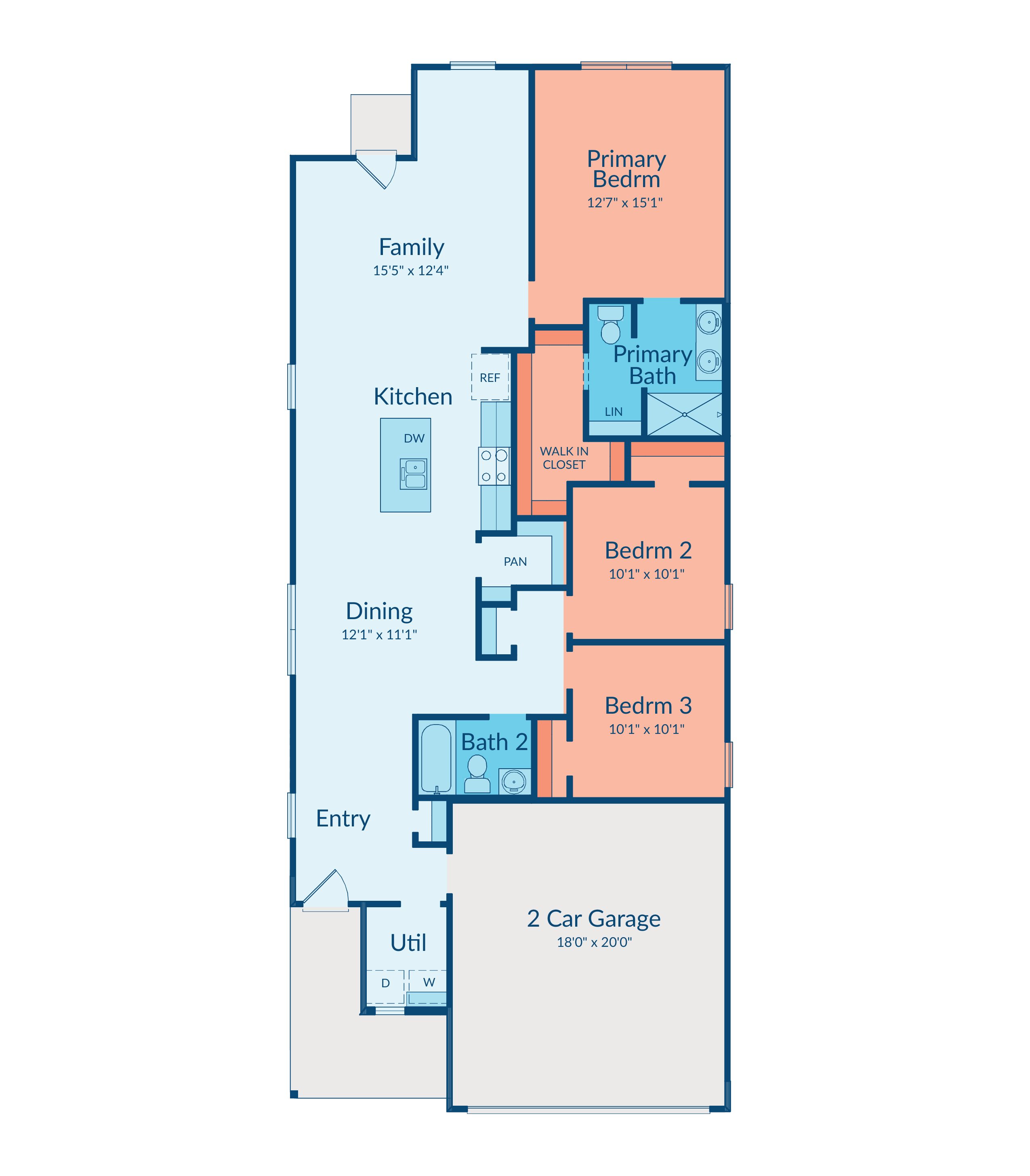 Sight lines extend from the front door to the back windows, creating a bright and open design. The open kitchen includes a walk-in pantry and center island for easy connection.